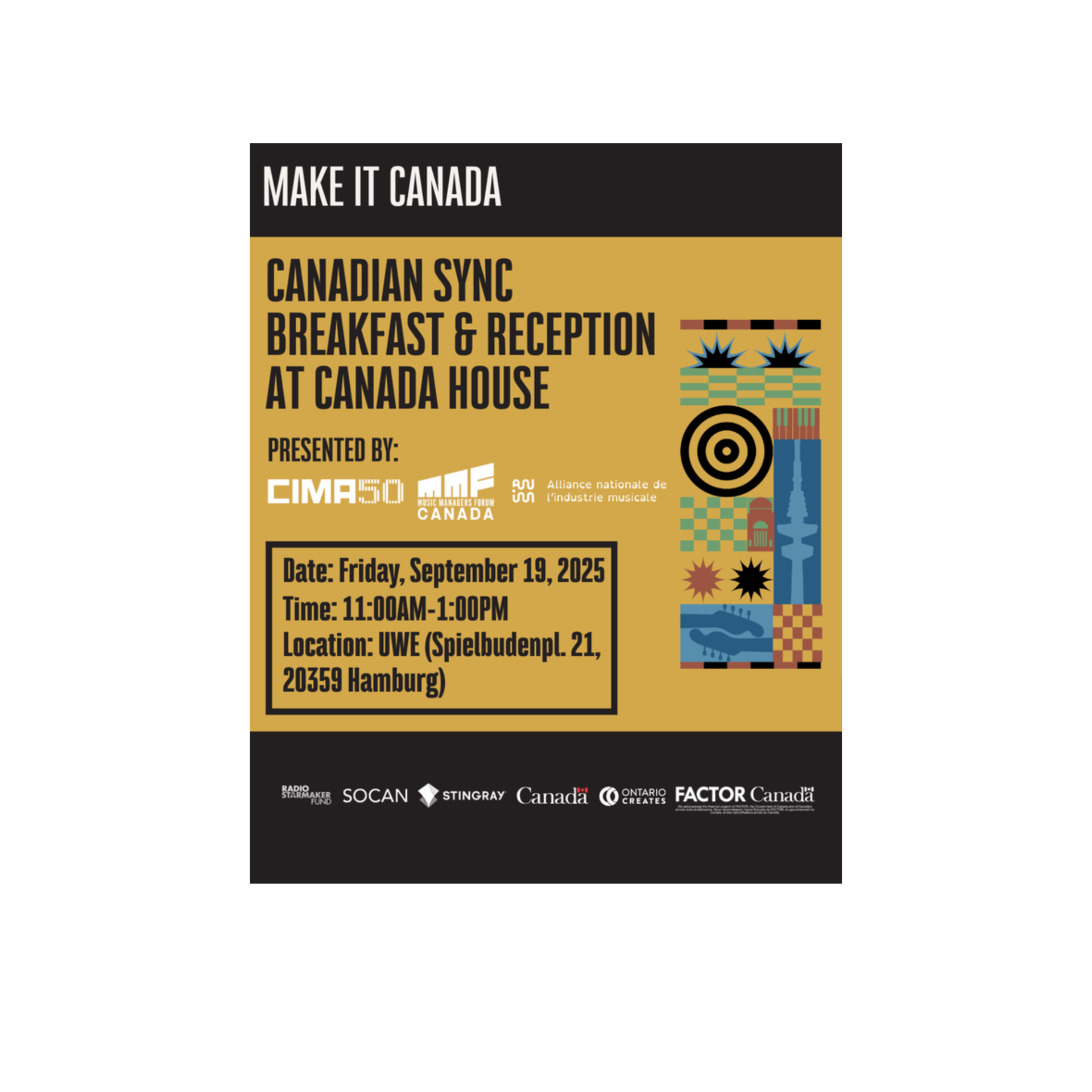CIMA, MMF Canada & ANIM will present a Canadian Sync Breakfast & Reception on Friday, September 19, 2025, from 11:00 AM – 1:00 PM at UWE (Canada House Venue) during Reeperbahn.