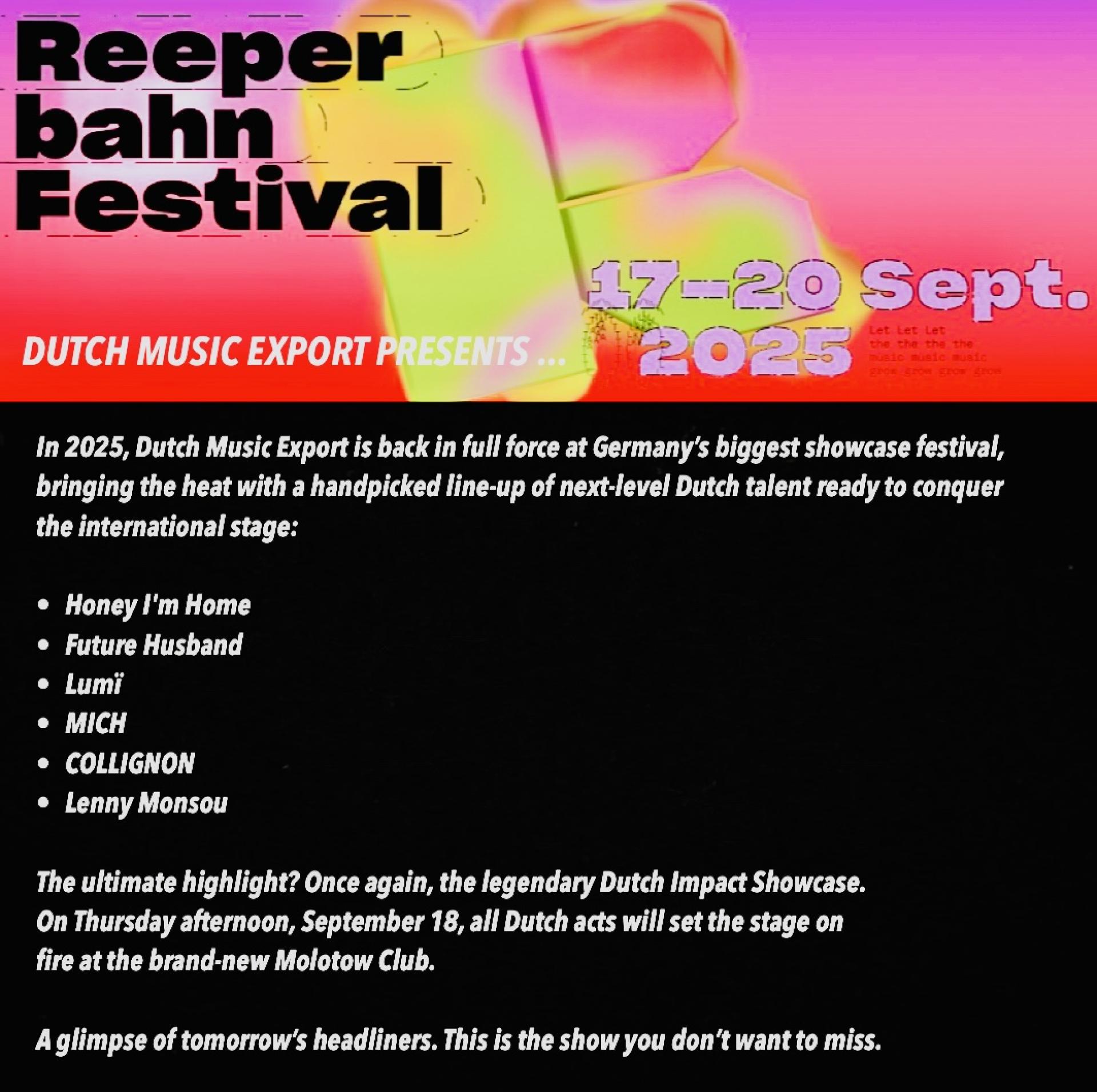 Dutch Music Export is back in full force at Germany’s biggest showcase festival; Reeperbahn Festival. Once again, the legendary Dutch Impact Showcase, Thursday afternoon, Sept. 18, all Dutch acts will set the stage on fire at the brand-new Molotow Club.
